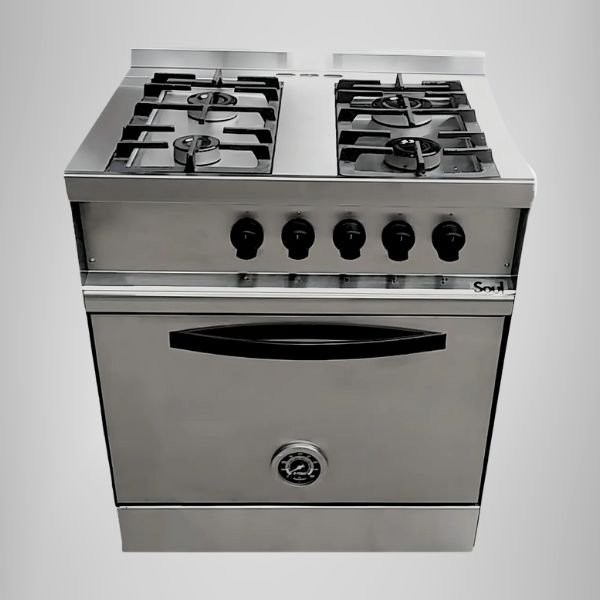 Cocina PEVI Soul profesional, multigas y fabricada en acero inoxidable ESM. Equipada con horno pizzero enlozado con válvula de seguridad, pirómetro y puerta ciega. Ideal para gastronomía intensiva, robusta y eficiente.